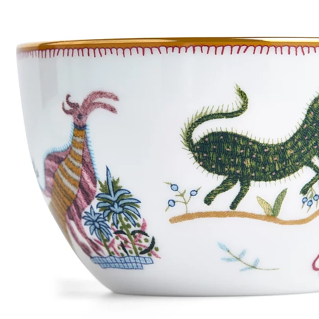 Tento originální vzor anglické designérky Kit Kemp s orientálním nádechem vychází z kolekce vyšívaných látek od Chelsea Textiles. Kit Kemp je známá jako spolumajitelka a designová ředitelka hotelů Firmdale, která je známá svými eklektickými a barevnými návrhy. Kit je často ovlivněn smyslem pro rozmarné a lyrické, stejně jako její láska ke zvířatům. Tato kolekce obsahuje velké i malé stvoření, které nese pouze její představivost. Ilustrativní styl řady je aplikován na hedvábně bílém kostním porcelánu a zdobený zlatou aplikací.