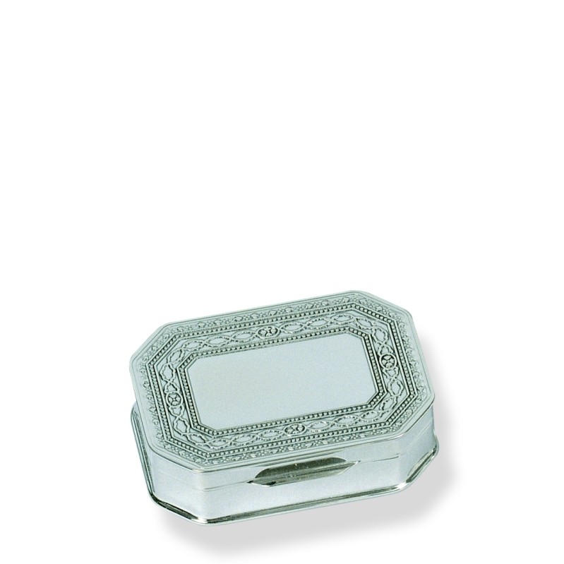Stříbrná krabička s uzavíratelným ozdobeným víčkem a s vyrytým květinovým motivem. Je to ideální dárek pro elegantní a noblesní dámu. Elegantní místo pro umělé sladidlo, léky, bonbóny nebo jiné drobnosti.