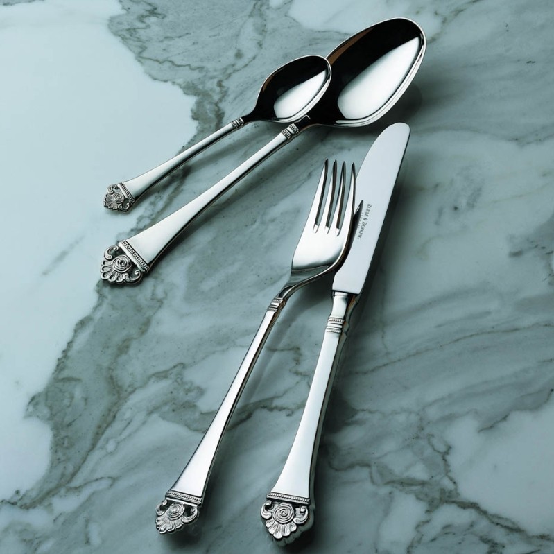 S láskou navržený okraj zlatých růží zobrazuje kouzlo tohoto elegantního a Krásná vzoru stříbrných příborů Robbe and Berking.