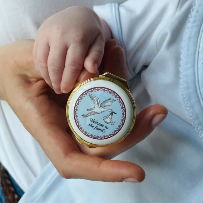 Tato smaltová krabička je inspirována starým vzorem Halcyon Days a představuje čápa přinášejícího novorozeně, mýtus, který si znovu získal popularitu v 19. století, kdy jej zpopularizoval Čáp od Hanse Christiana Andersena. Tato smaltová krabička byla ručně vyrobená v Anglii za použití staletí starých technik. Bude určitě jedinečným dárkem, který si budete cenit po mnoho let. Poslouží pro uschování prvních vlásků nebo vypadlého zoubku.