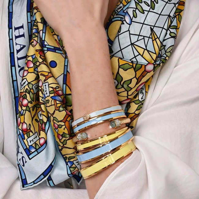 Od „jedinečných“ ručně zdobených náramků až po moderní pánské šperky, Halcyon Days má doplňky, které vyhoví každému vkusu. Objevte příběh a inspiraci s kolekcemi mistrovských děl. Tyto smaltované náramky byly ručně vyrobeny a ručně zdobeny v Anglii řemeslníky Halcyon Days. Jejich design je předurčen k tomu, aby potěšil každou milovnici náramků.