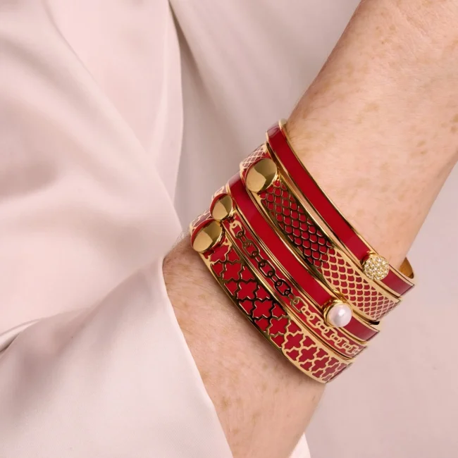 Tento elegantní náramek v červené a zlaté barvě, který měří 10 mm na šířku a vyznačuje se velmi oblíbeným vzorem Agama. Odklápěcí část zajišťuje snadné a pohodlné nošení, takže je ideálním doplňkem pro každou příležitost. Ať už se nosí samostatně nebo v kombinaci, tento náramek dodá každému outfitu sofistikovaný nádech. Skutečný kus, který ztělesňuje umění a řemeslo, které definují naši kolekci.