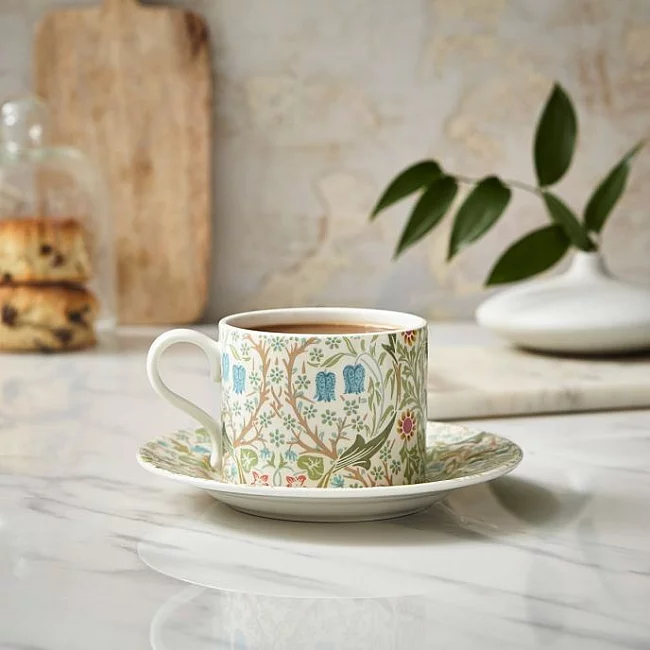 Pozvedněte své čajové nádobí s naším krásným šálkem a podšálkem Morris & Co. Blackthorn. Navrhl J.H. Dearle v roce 1892 tento vzor se vyznačuje živými květinami a hustou zelení, které vám umožní vnést do vaší kuchyně dotek exteriéru. Ať už zkombinujete náš trnkový šálek a podšálek s ostatními vzory v řadě, nebo si dopřejete kompletní sadu, tato ikonická sada šálků a podšálků vnese do vašeho domova dotek vašeho nezaměnitelného stylu.