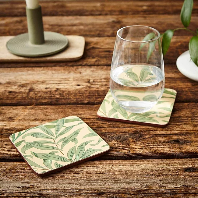 Krásně elegantní, udejte tón s touto sadou šesti tácků se vzorem Morris & Co. Willow Bough v zelené barvě. Každý ze šesti podtácků běžné velikosti je vyroben z 5 mm desky zcela utěsněné vysoce kvalitním povlakem, který je odolný vůči skvrnám i teplu do 100 C, a zakončený odolným a izolačním korkem, který chrání povrchy. K dispozici jsou také odpovídající sady šesti prostírání běžné velikosti a čtyř větších prostírání pro vytvoření plně koordinovaného prostírání.