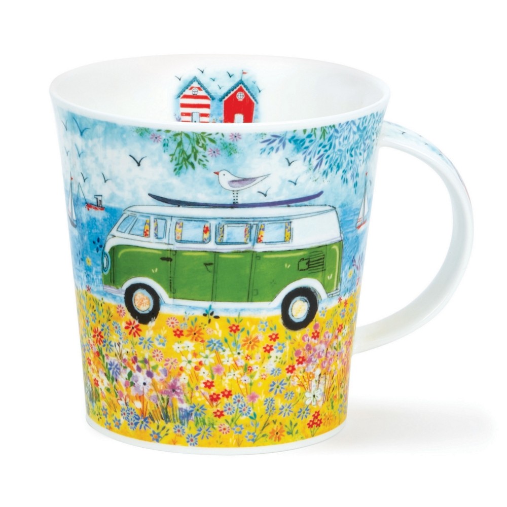 Kdo by nemiloval vzrušení z cesty a svobody spojené s Campervanem. Na zlatožlutém písku je zaparkovaný zelený karavan s výhledem na rušnou zátoku, kde se potulují rybářské lodě a plachetnice, s několika plážovými chatkami na zadní straně hrnku.