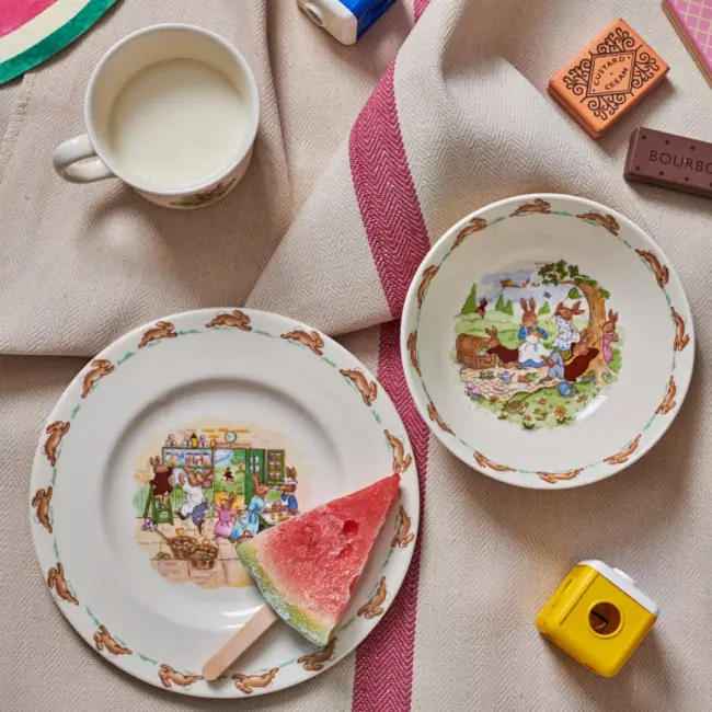 Skočte rovnou na snídani nebo svačinu s touto dvoudílnou sadou Bunnykins pro děti. Navrženo a vyrobené tak, aby vydrželo co nejdéle. Obsahuje misku na snídani s „rodinným piknikem“ a hrnek zobrazující scénu se zajíčky před domem, kteří jedí. Vyrobeno z odolné kameniny, kterou lze mýt v myčce. Ať už se je rozhodnete používat každý den, nebo si je schováte pro zvláštní příležitosti, jsou to kousky, které budete chtít předávat z generace na generaci.