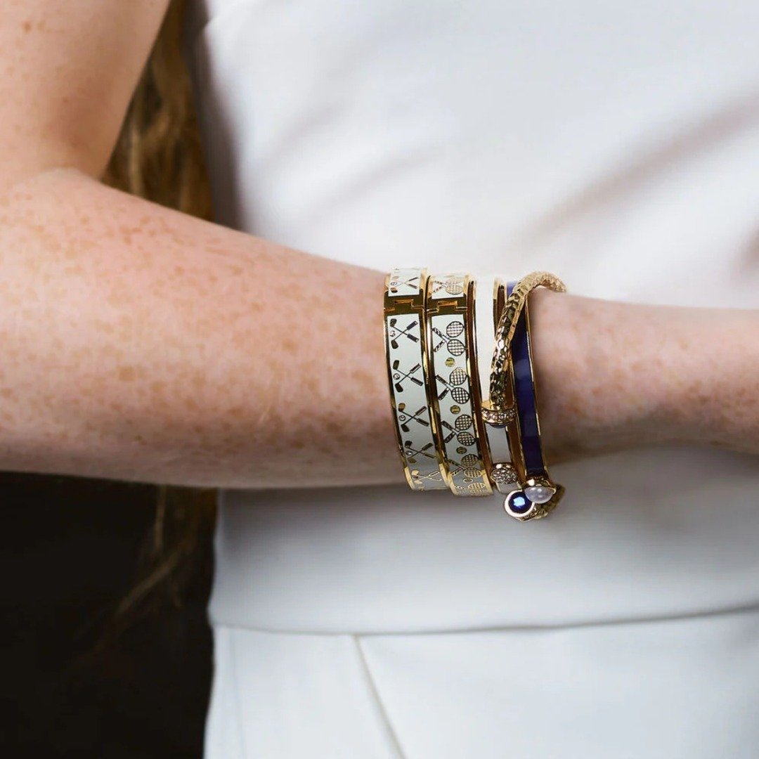 Tento náramek se vzorem tenisové rakety a míčku je 10 mm široký. Odklápěcí část zajišťuje snadné a pohodlné nošení, takže je ideálním doplňkem pro každou příležitost. Ať už se nosí samostatně nebo v kombinaci, tento náramek dodá každému outfitu sofistikovaný nádech. Skutečný kus, který ztělesňuje umění a řemeslo, které definují tuto kolekci. Jako dárek potěší milovnici tenisu.