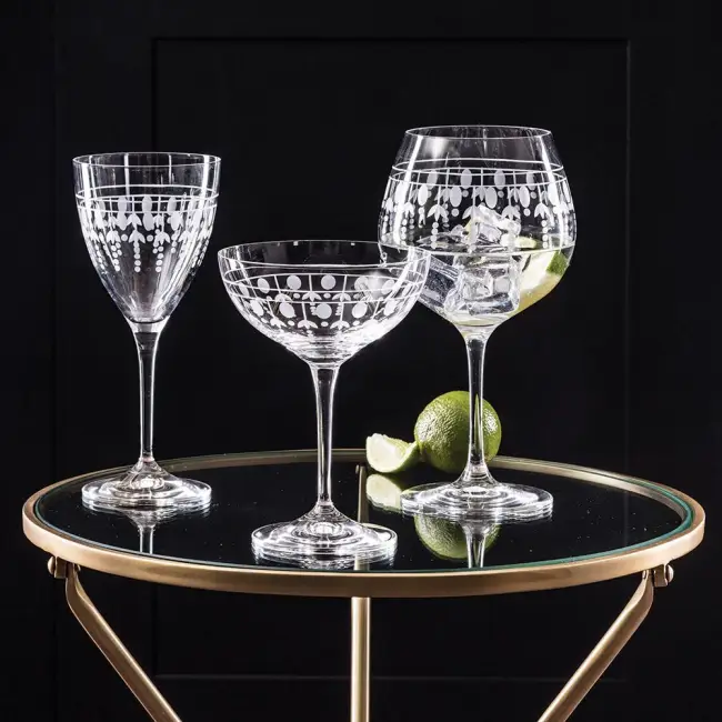 Kolekce křišťálového skla Nouveau od sklárny Royal Scot Crystal je vyrobena z nejkvalitnějšího křišťálu, ale má jednoduchý a klasický design, aby vyhovoval každému účelu. Jasný rostlinný vzor se složitým matným hlubotiskovým vzorem, který připomíná éru seces.