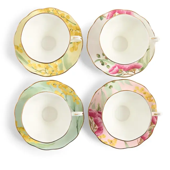 Tato speciální sada je dokonalým způsobem, jak si vychutnat osvěžující nápoj, a je jedním z plodů kreativní spolupráce mezi Mirandou Kerr a Royal Albert. Krádné podšálky a jemné šálky s umělecky provedenými uchy byly vyrobené z jemného kostního porcelánu a jsou zdobeny krásným australským vzorem.