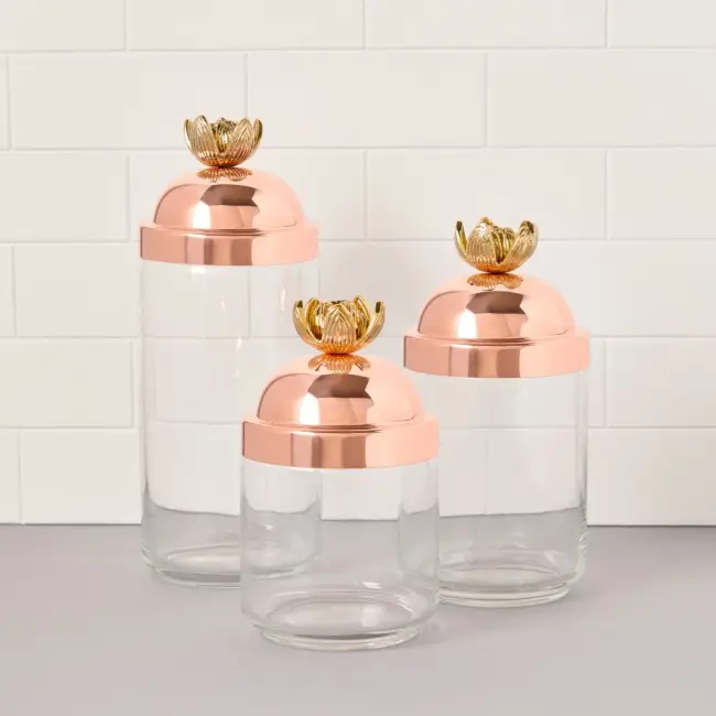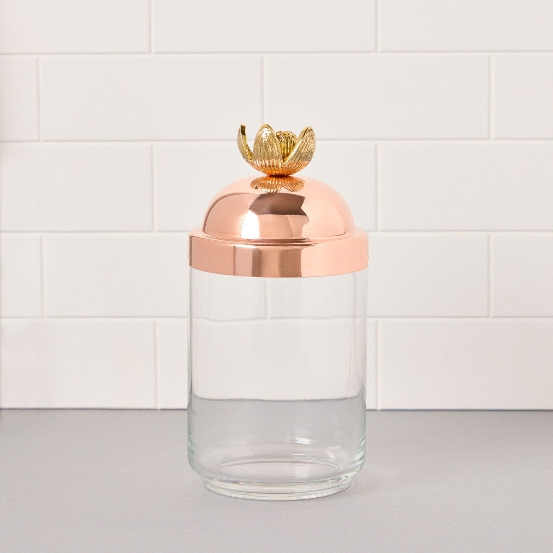 Střední kuchyňská dóza je ideální pro uchovávání müsli, sušenek nebo vaší oblíbené řemeslné kávy v čerstvém stavu díky silikonovému těsnění. Můžete ji vystavit společně s dalšími dvěma kuchyňskými dózami z kolekce Lotus a vytvořit tak krásně sladěnou sadu, nebo je rozmístit po kuchyni tak, aby jemně, ale nepřehlédnutelně prosvítající měděný lesk upoutal pozornost vašich hostů.