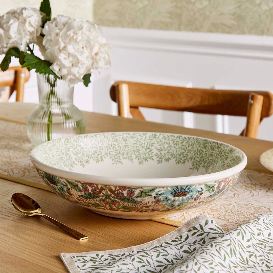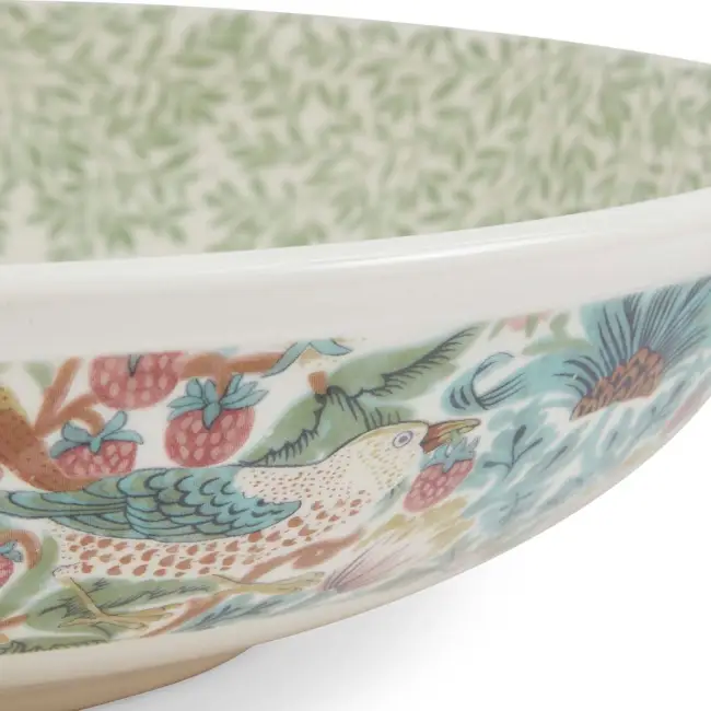 Proměňte každé stolování v okamžik plný krásy s touto hlubokou miskou z kolekce Morris & Co. značky Spode. Ikonický dekor Strawberry Thief v jemných odstínech růžové a zelené zdobí vnější část, zatímco vnitřek oživují splývavé listy vzoru Standen. Tato výrazná mísa je ideální pro servírování salátů, těstovin i pokrmů ke sdílení.