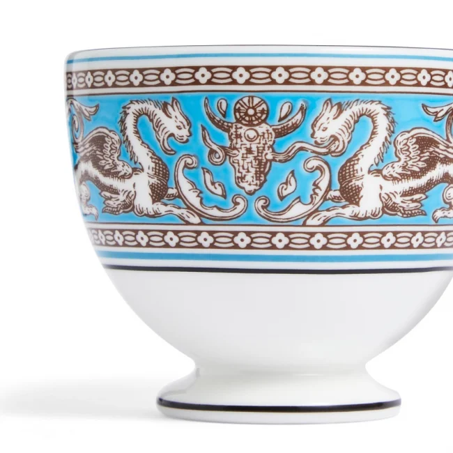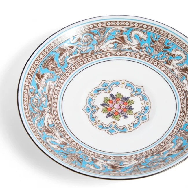 Objevte zemi, kde se potulují bájní tvorové a kvete fantastická flóra, zemi ležící někde mezi časem večeře a odpoledním čajem. Díky bohatství jemně ručně vykreslených motivů postavených proti jasnosti hedvábně bílého jemného kostního porcelánu je florentská tyrkysová kolekce zalitá ve fantazii, kde řvoucí griffiny s orlí hlavou a lvíčkem sledují řev a kořeny přesahují vaši nejdivočejší představivost.
