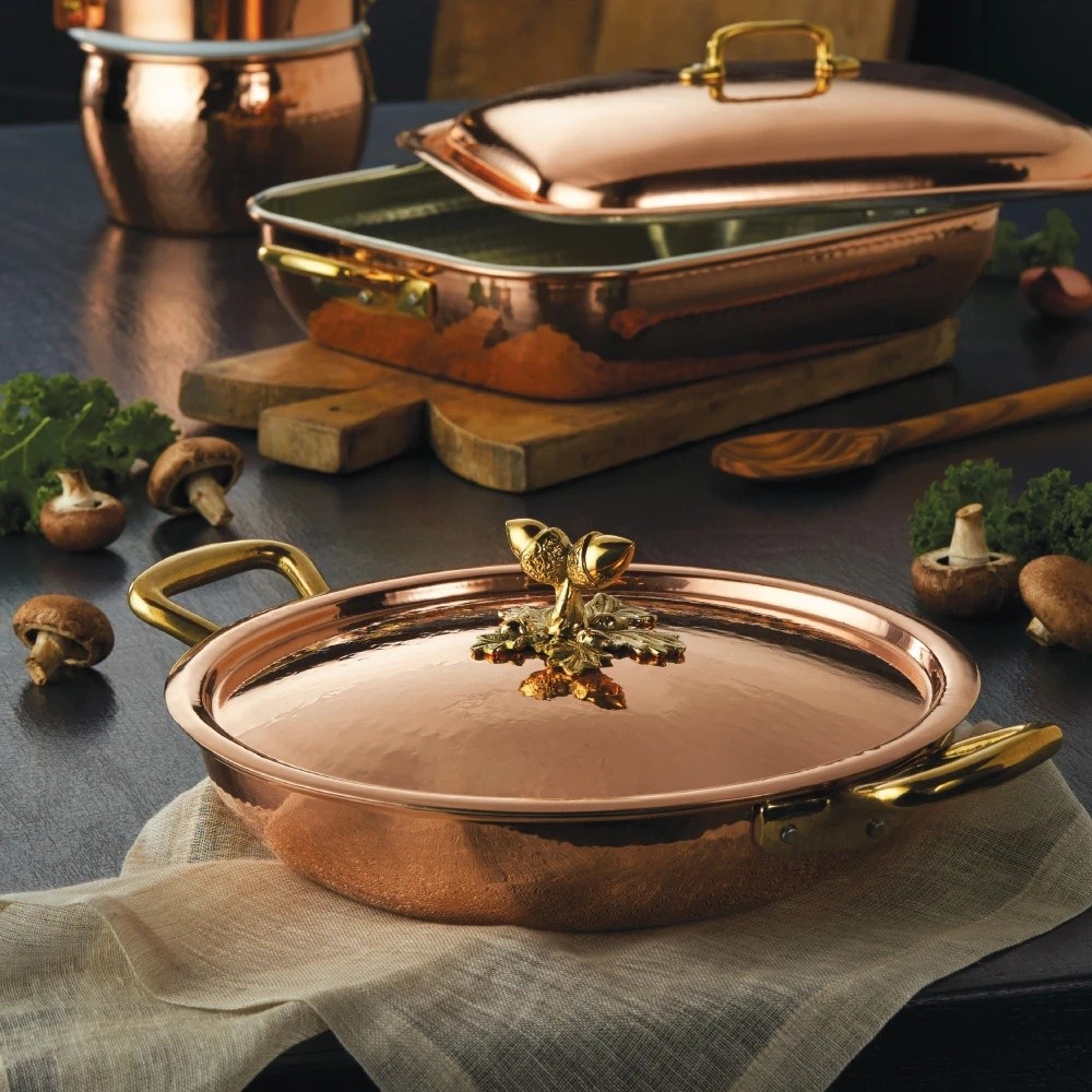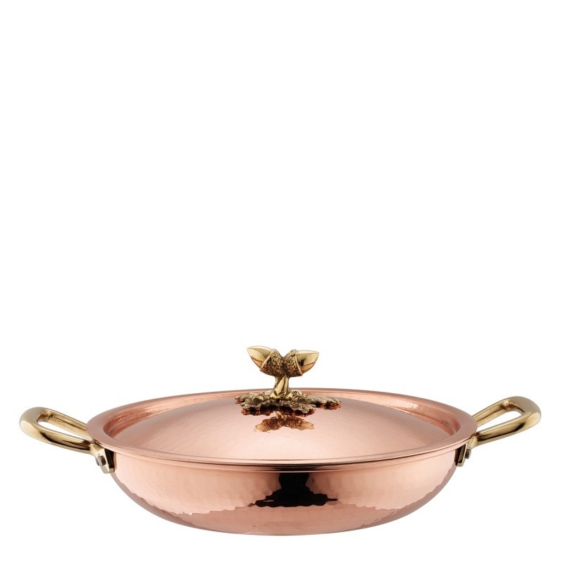 Tyto nádherné výtvory jsou jedinečnými kusy, kterým patří místo na tabuli. Tyto měděné předměty jsou nejvýznamnějším vyjádřením výjimečných technických a uměleckých schopností našich mistrů mědikovců a s nimi zachováváme staletí historie, zkušeností a tradic. Navrženo pro použití na plynovém a elektrickém sporáku nebo v troubě, vyrobeno z masívní mědi o tloušťce 1,0-1,5 mm. Kováno a cínováno ručně, držadla a úchyty z leštěné lité mosaze.